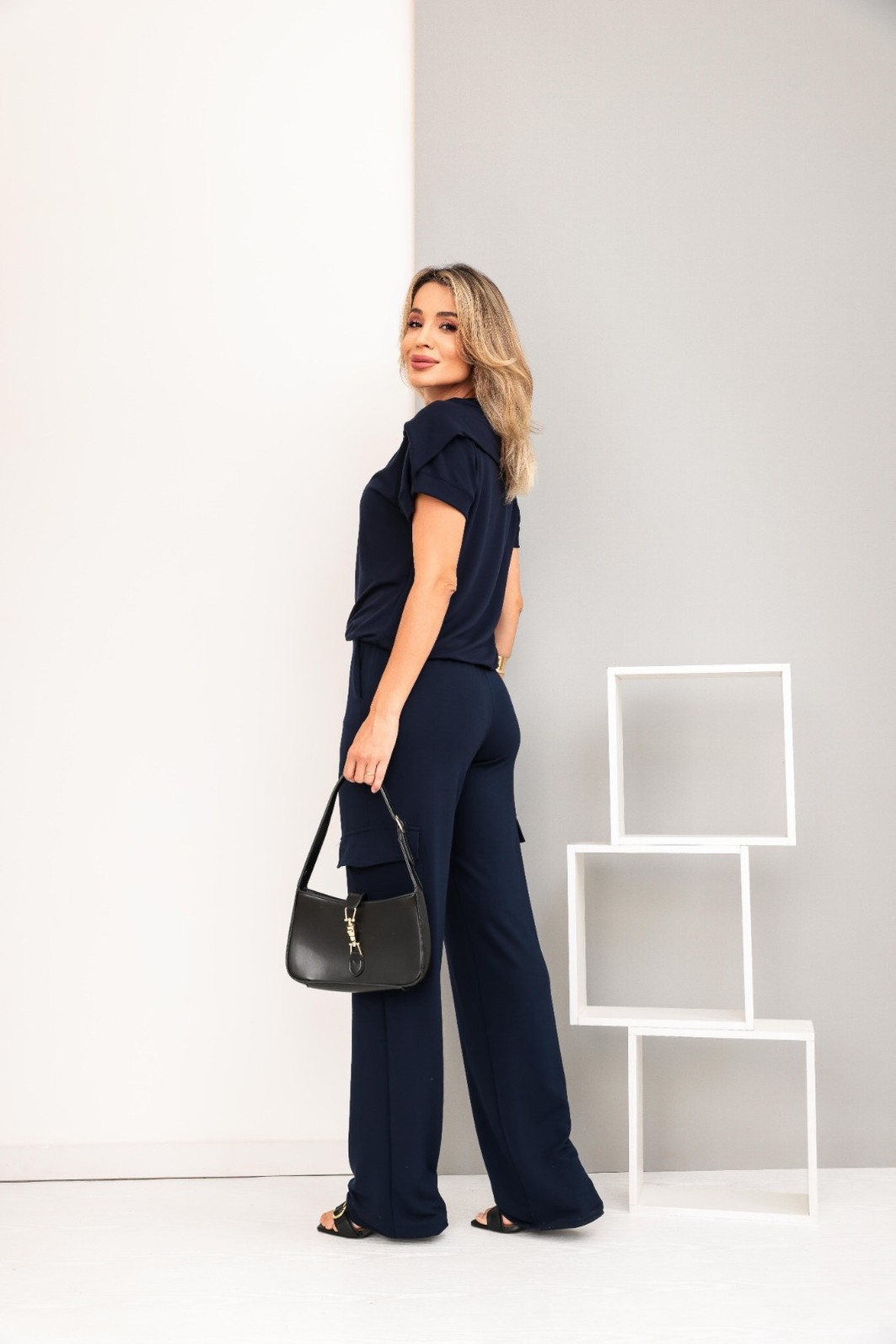 Calça: cintura média com elástico, bolsos funcionais e modelagem pantalona que alonga a silhueta.