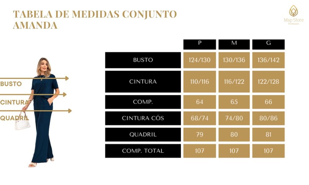 Calça: cintura média com elástico, bolsos funcionais e modelagem pantalona que alonga a silhueta.