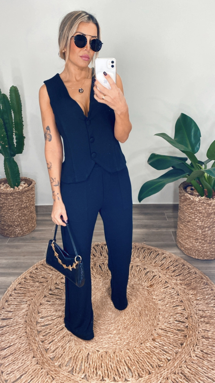 Ele é composto por colete e maxi pantalona é o mais moderno da estação por ser extremamente fácil de usar e compor looks incríveis com apenas criatividade. Modernidade e conforto em um look que reflete além de tudo elegância. Colete básico com botões forrado e maxi pantalona com bolsos funcionais e elástico no cós rebatido, vista fake. Vestindo mulheres com conforto e elegância.
