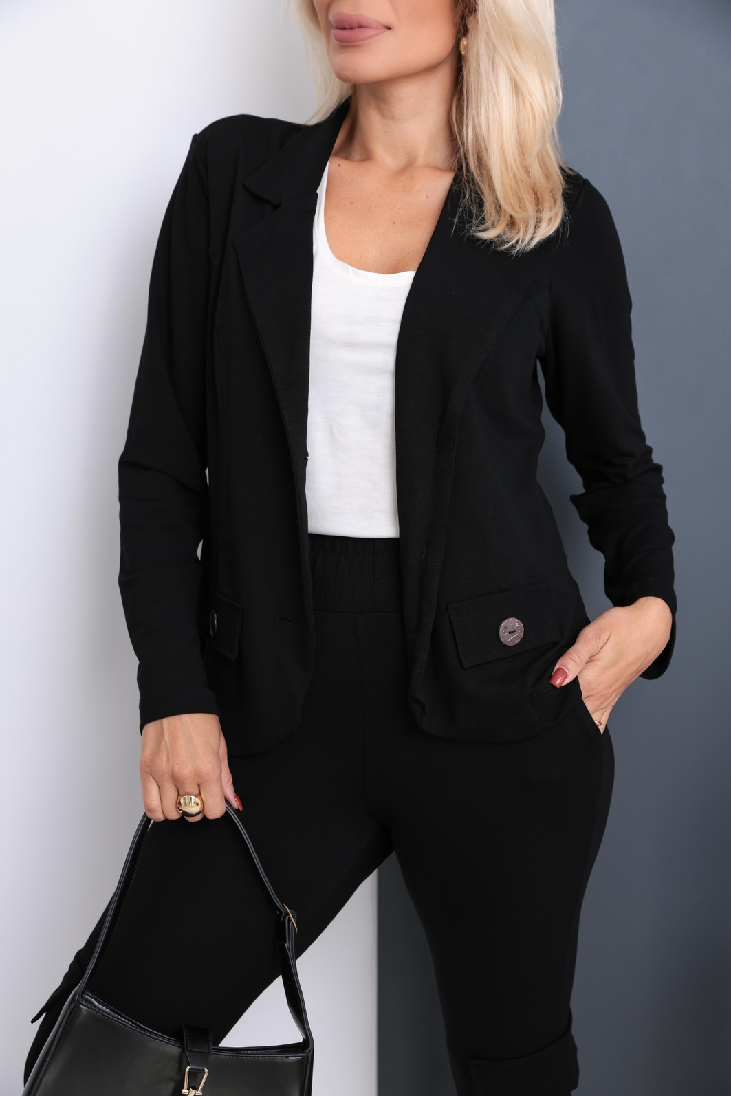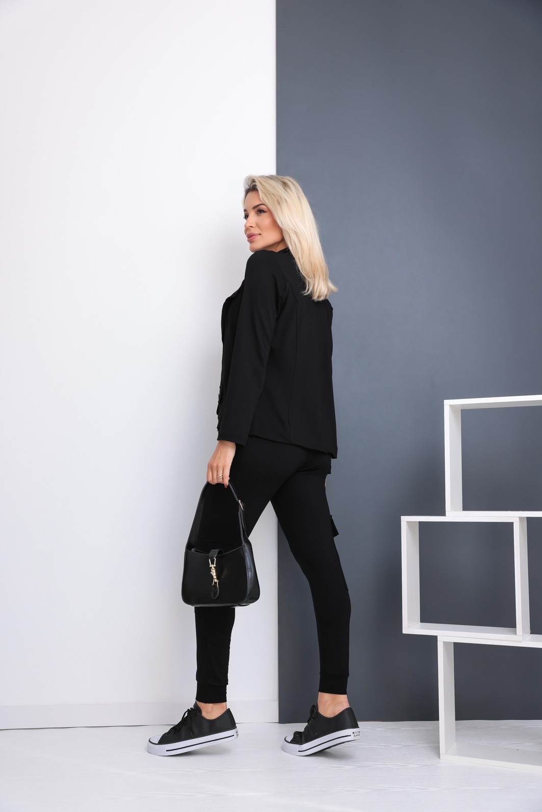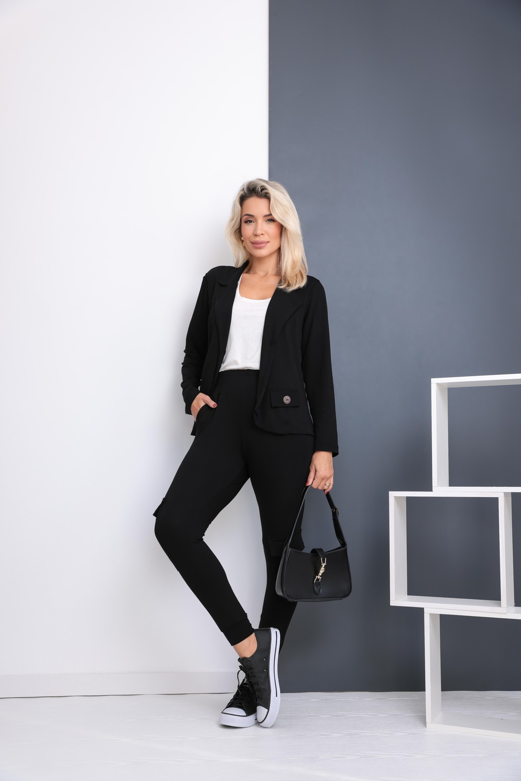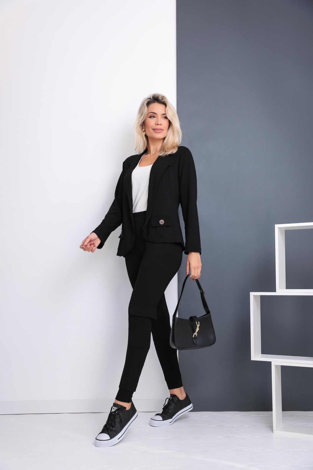 Ele é composto por 3 peças com uma pegada esporte chique transitando em diversos looks deixando multifuncional e com um ar despojado ao mesmo tempo.Combinando entre eles e entre outras variações de looks no seu guarda roupas. Sua modelagem composta com blazer certinho ao corpo, regata básica e calça jogger com bolsos cargo e funcional, não possui forro e cós tem largura de 8 cm rebatido.