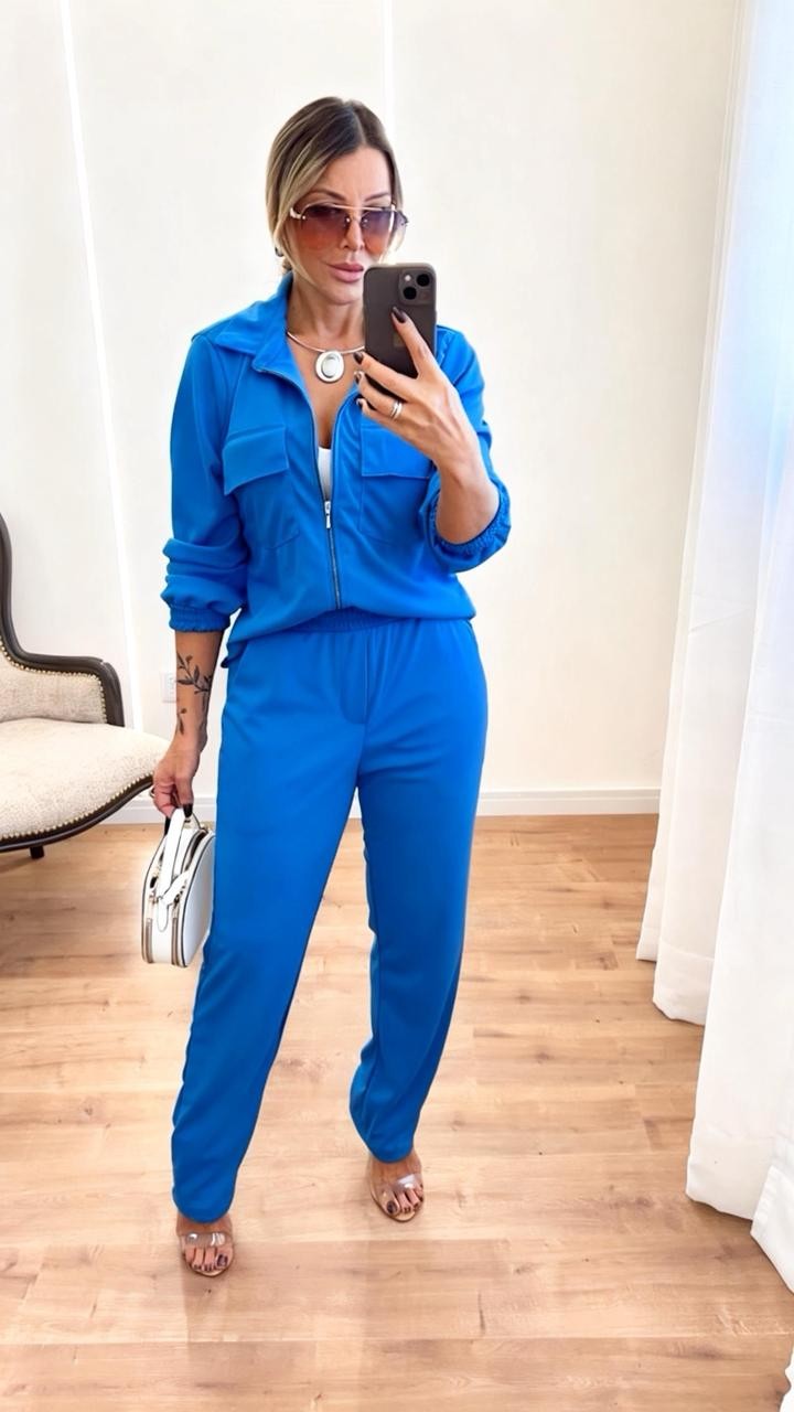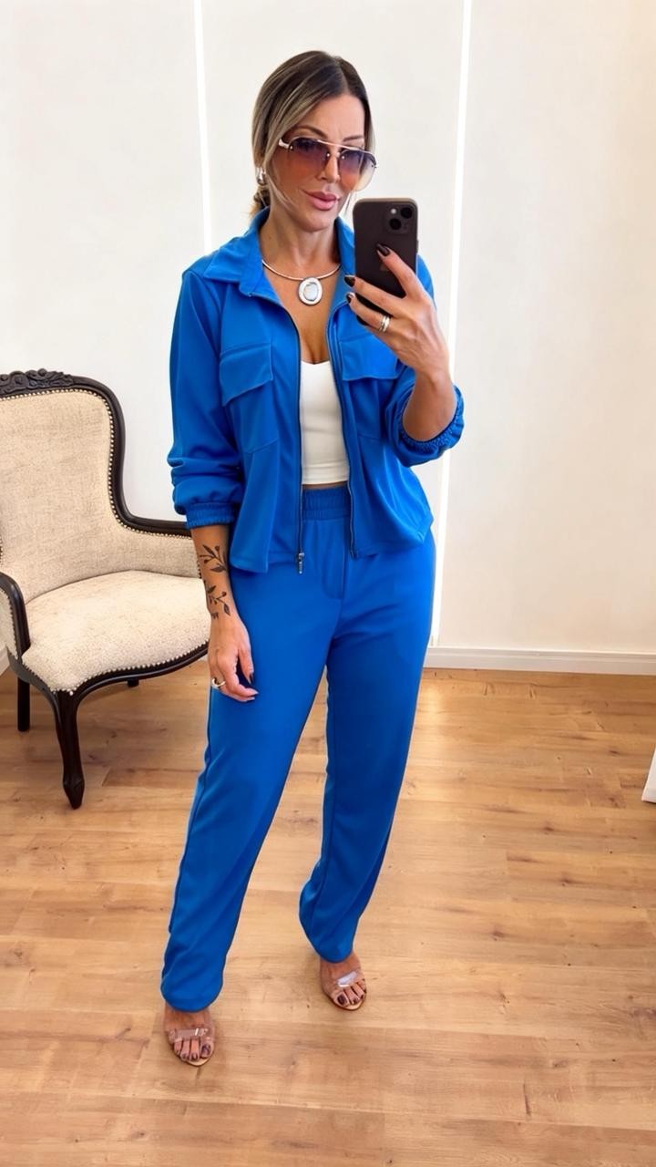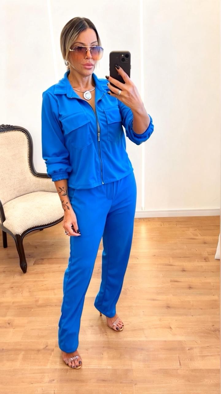 Ele é composto por uma bomber com zíper e uma calça com recorte alfaiataria estilo cigarrete cenoura para usar e compor look incríveis com apenas criatividade, podendo ser usado junto ou separado, aberto ou fechado. Modernidade e conforto em um look que reflete além de tudo elegância. Sua modelagem da Bomber é quadrada sem marcar a cintura com zíper e punho de elástico com bolsos frontal funcional, a calça estilo alfaiataria com recorte cenoura , possui um forro com elastano e bolsos funcionais. Veste com elegância mulheres do 36 ao 46.