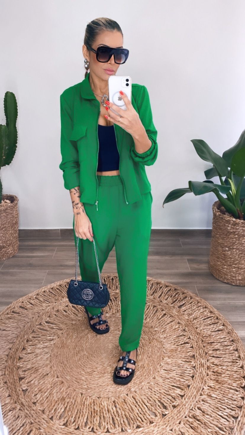 Tanto a bomber quanto a calça contam com bolsos funcionais, unindo praticidade ao visual elegante.