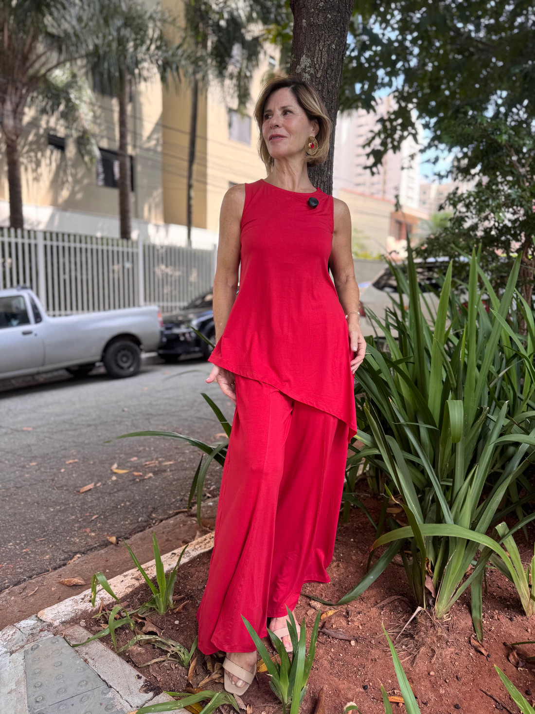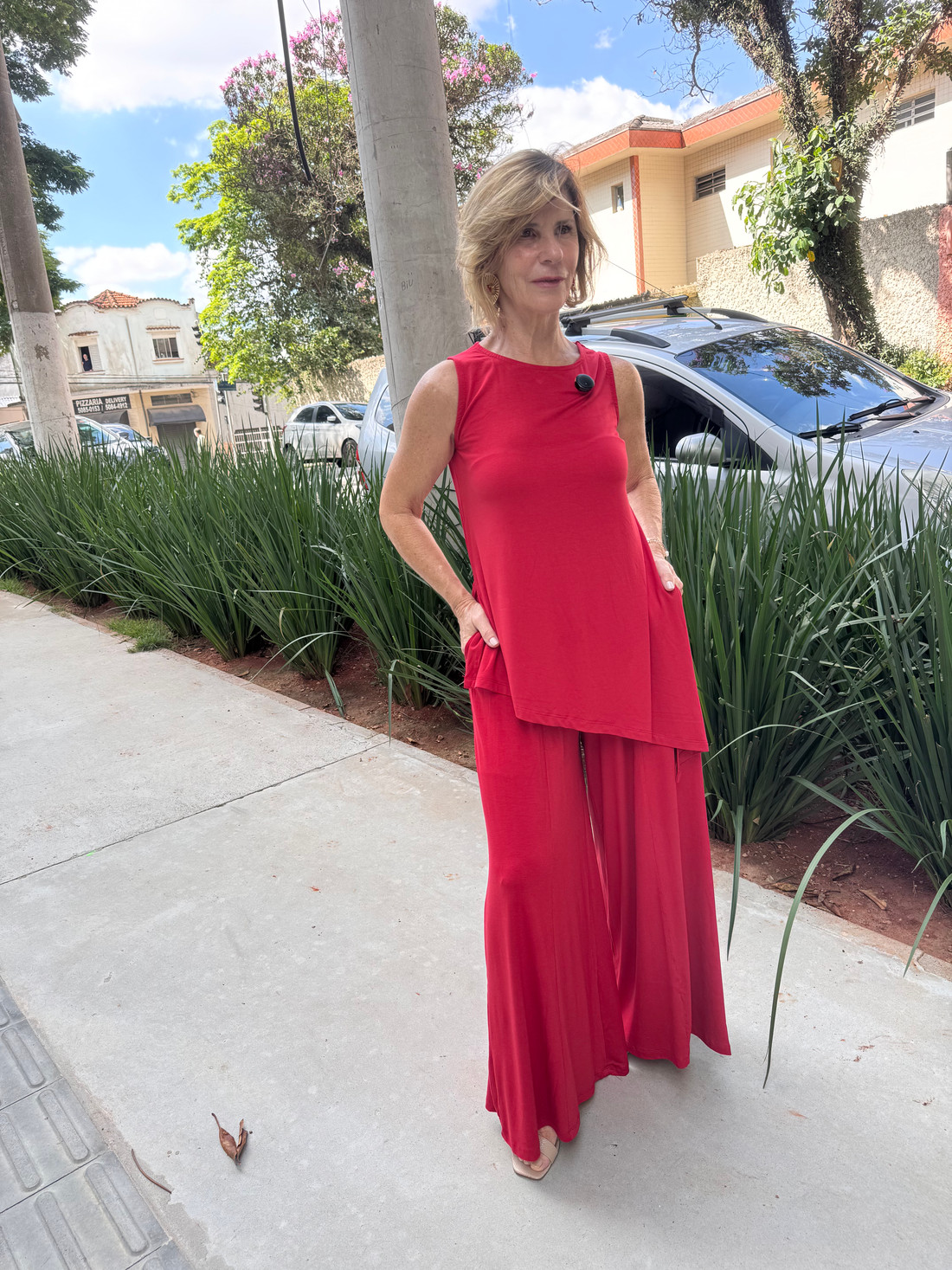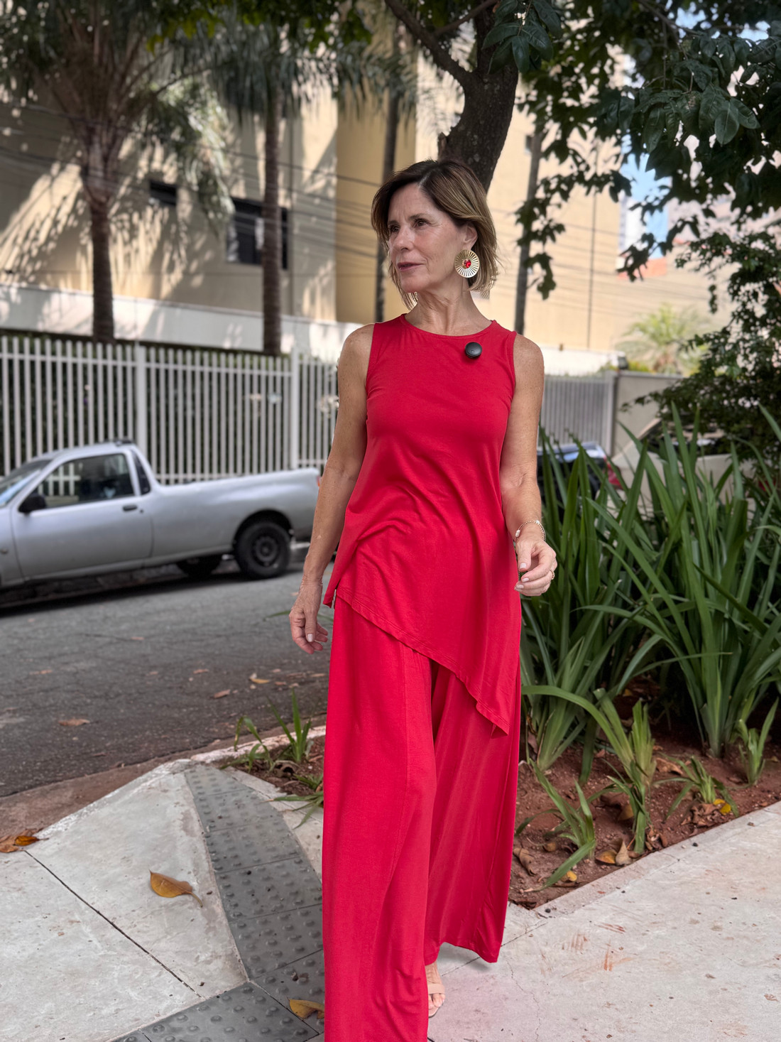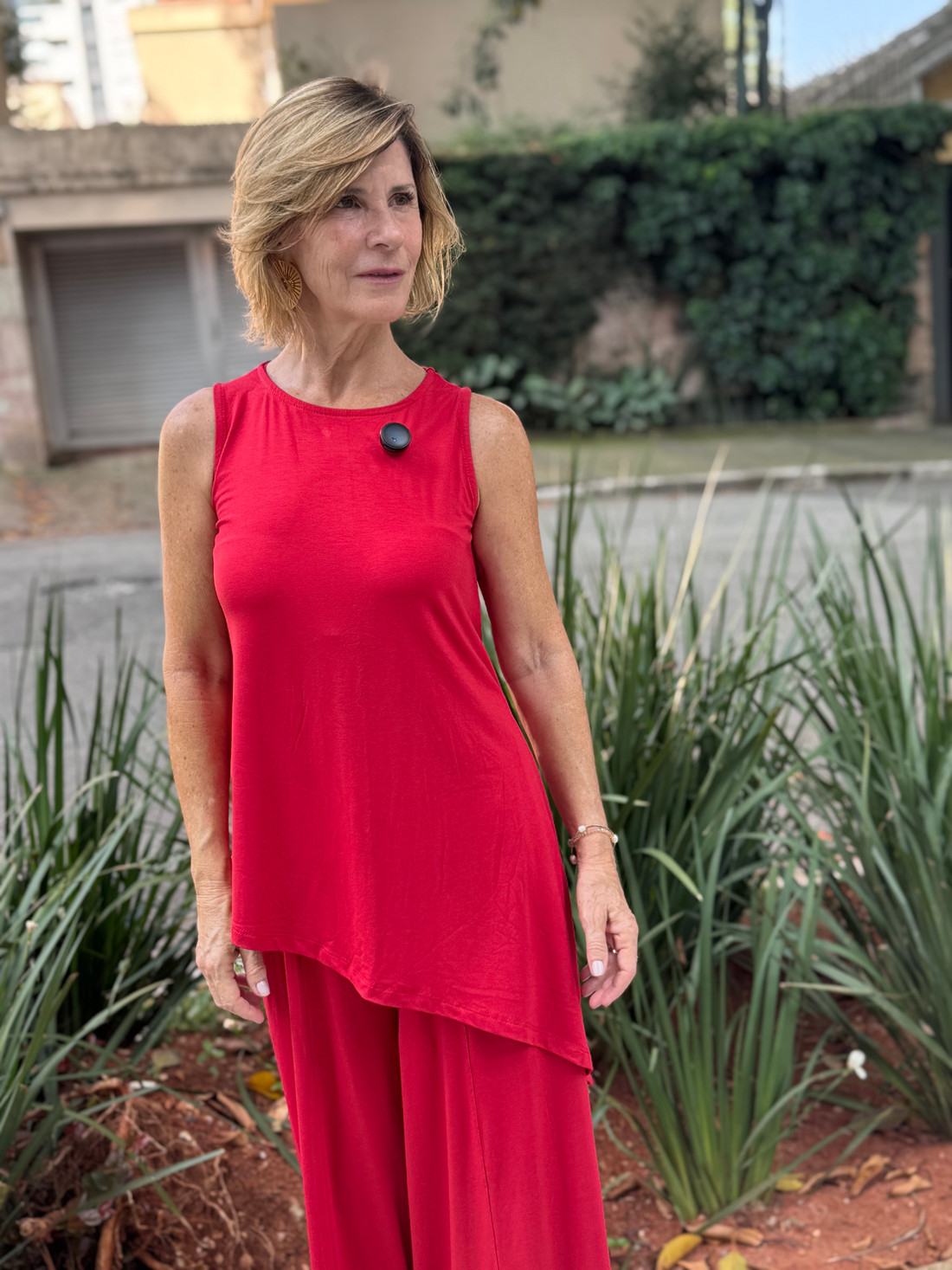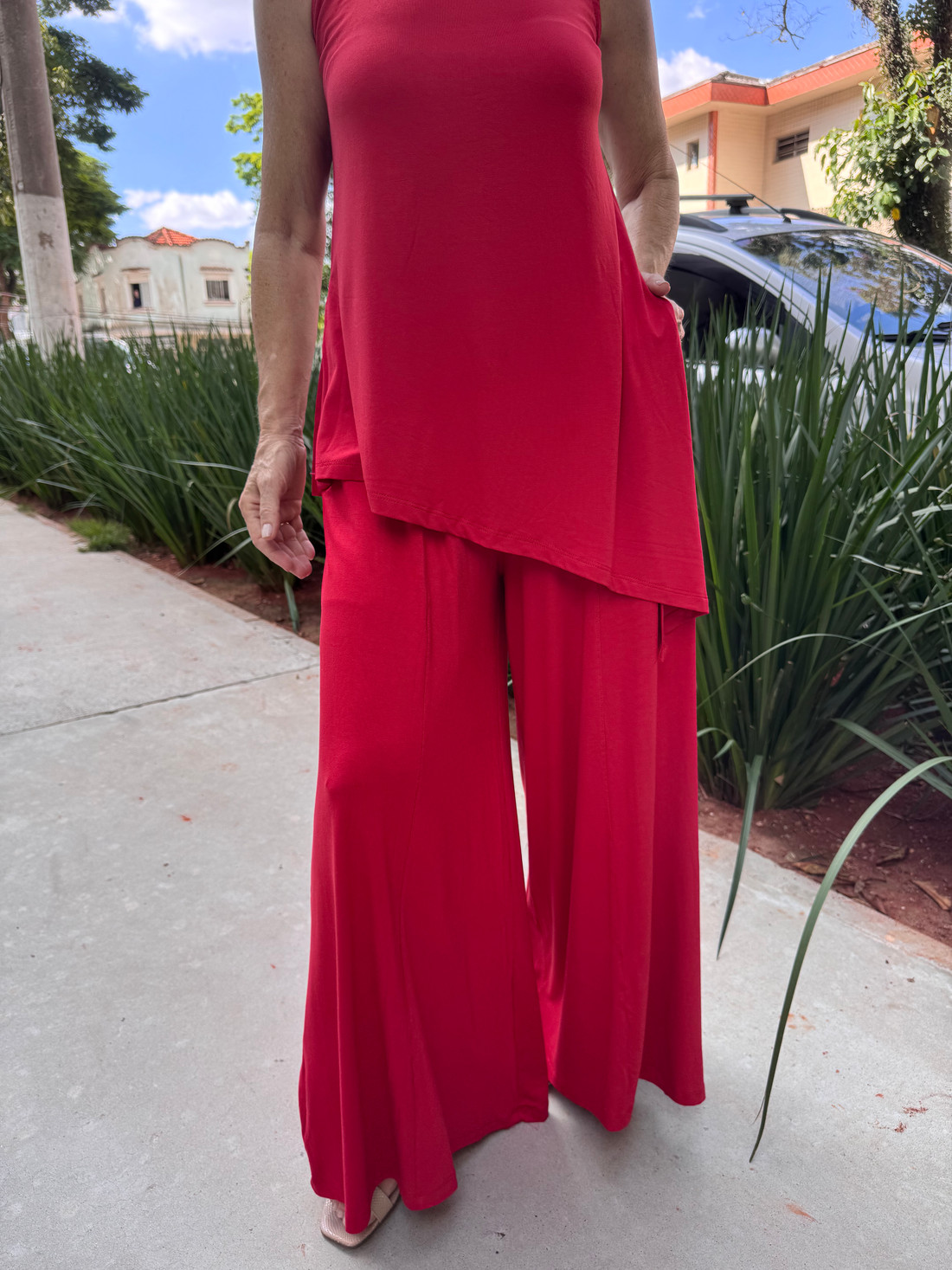 A calça max pantalona e a blusa regata assimétrica, confeccionadas em viscolycra premium, formam um conjunto elegante que traduz leveza e sofisticação em cada detalhe. Com caimento fluido e toque macio, as peças se complementam perfeitamente, criando um visual moderno, confortável e cheio de estilo — ideal para quem ama se vestir bem com naturalidade e charme.
