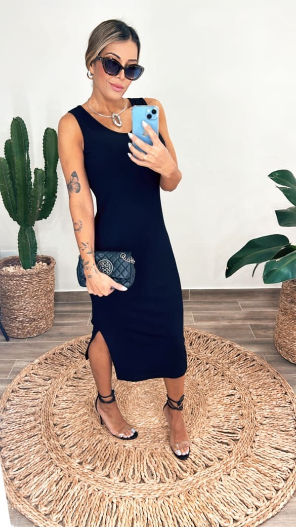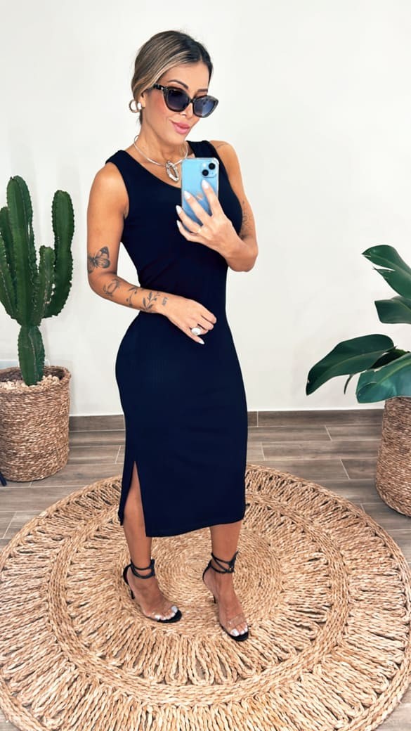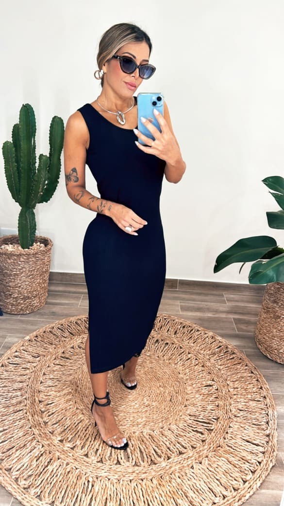 Vestido canelado gola V básico, um clássico, sem igual para usar com todo e em todas as estações. Modelagem é mais justa ao corpo com decote V e regata trazendo elegância e atemporalidade.